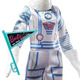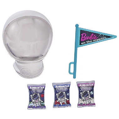 Includes: Barbie doll wearing spacesuit and boots, helmet, gloves, flag and 3 packs of astronaut "food."