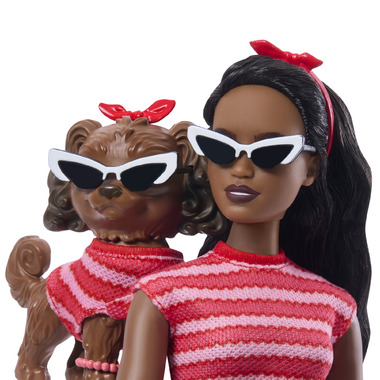 Talk about best friends fur-ever! With Barbie Twinning Looks sets, Barbie dolls and their cutely coordinated pet dogs dress up in matching outfits! Barbie doll and her puppy perfectly match in wavy red stripes! Barbie wears white sneakers and a two-piece set with a knotted tie detail that is a mirror image of the tie on her puppy's top! Luckily, their accessories come in sets of two as well! Style the duo in cat-eye sunglasses, red hair bows, and peach bracelets.Coordinated accessories like a peach collar and leash, as well as a yellow camera for the doll and a yellow camera bag for her puppy, add to the twinning and storytelling fun. After dressing up both Barbie doll and her pet pooch in twinning looks, set the scene by posing them together in fun stances -- Barbie has bendable joints for just this kind of realistic play! Barbie Twinning Looks dolls make great gifts for kids 3 years and up -- especially those who love imagining pet stories and getting creative with fashion!
