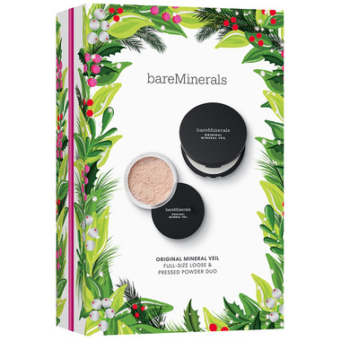 bareMinerals ORIGINAL MINERAL VEIL Full-Size Loose & Pressed Powder Duo locks in your holiday look, setting and extending makeup while giving skin an airbrushed finish. Use the fan-favorite loose MINERAL VEIL Powder at home and take the pressed version along for touch-ups on-the-go.