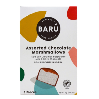 Contains the perfect assortment of 8, individually packaged, all-natural Baru marshmallows! Flavors include Sea Salt Caramel, Raspberry, Milk Chocolate, and Dark Chocolate.