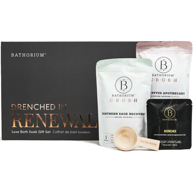 Featuring three of Bathorium's magnesium rich bath soaks (600g Northern Sage Recovery Crush Bath Soak, 600g Eucalyptus Apothecary Crush Bath Soak, 100g Hinoki Magnesium Bath Flake Soak and their signature Bathorium Scoop, this collection delivers a multisensory bath ritual that clears the mind and helps to soothe sore joints and muscles.