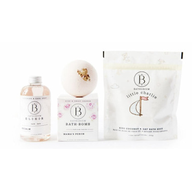 A gift for Mommy and Baby! This gift set includes Bathorium's signature Little Charlie Kids Bath Soak, one Mama's Perch Bath Bomb with rose geranium and sweet orange oils as well as a bottle of BeCalm bubble elixir.
