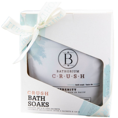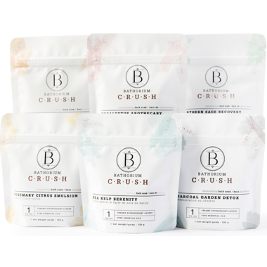 Indulge in one of each of Bathorium's signature Crush bath soaks. A great way to see which soak is your personal favourite. FYI- This is the perfect gift for any bath lover in your life. Includes: One 120g sachet of: Ancient Oat Hydration, Sea Kelp Serenity, Charcoal Garden Detox, Northern Sage Recovery, Eucalyptus Apothecary.
