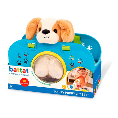Turn into a veterinarian with the Happy Puppy Vet Set from Battat! This 11-piece vet kit encourages nurturing play thanks to its adorable plush pup and medical accessories. Does the puppy have a cold? Use the toy stethoscope to listen to the pups heartbeat! Got an ouchie? Apply the soft bandage. Also included is a pet cone, forceps, tweezers, a toy syringe, and a checklist for more vet play opportunities. Feeling better? Feed the dog the can of food and treat it to a bone. Then, put your plush pet into its carrier for adventures on the go! Playing with stuffed animals and medical toys sparks the imagination and encourages empathy.