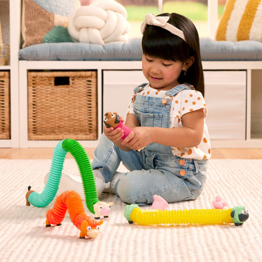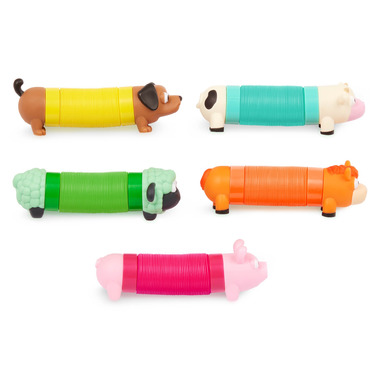 Its a friendly farm frenzy with the Lil' Barn Buddies from Battat! This wonderful set of sensory animal tubes includes 5 adorable farm animal heads, 5 bottoms, and 5 stretchy, colorful, poppy accordion-style tubes. Mix and match the animals bodies with the tubes! Then, pop, pull, twist, and stretch your way to farmyard fun. Theres a horse, a cow, a sheep, a dog, and a pig, each with big bright eyes and sweet faces. These tactile and versatile toys are fantastic for fine motor skill development, as well as to encourage hands-on, creative play. They're also great for keeping kids busy on road trips and adventures on the go!