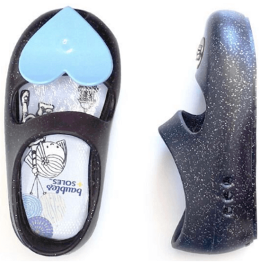 One shoe for everyday, water play, dress-up and occasions. Interchangeable twist lock allows you to change out the baubles to style with different outfits. The patented material is strong yet soft, lightweight and flexible for growing feet. It's made of a recyclable blend of plastics that is far superior than other plastics used in similar shoes and sandals.