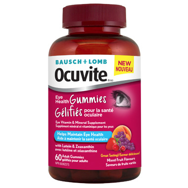 Bausch & Lomb Ocuvite Gummies are dedicated to helping protect your eye health. The great-tasting mixed-fruit flavors are packed with Lutein, Zeaxanthin and other eye nutrients.