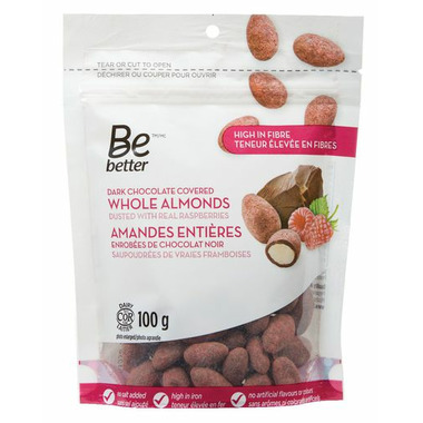 Ingredients: Almonds, Dark chocolate (sugar, unsweetened chocolate, cocoa butter, soy lecithin, natural flavour, milk ingredients), Raspberry powder, Canola oil, Gum Arabic, Sugars (sugar, corn syrup, maltodextrin), Cornstarch, Sunflower lecithin, Sunflower oil, Natural flavour.