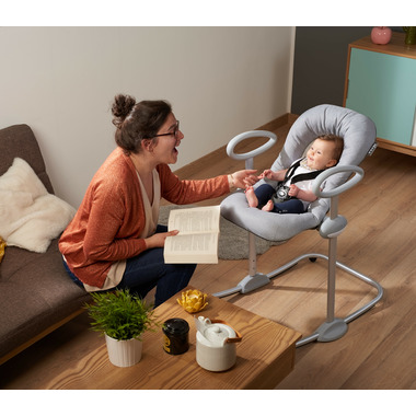 With its adjustable height, now you can include your little one in all the family activities so they don't feel left out! Have them sit with you at the dinner table, in the garden or even on the sofa for story time. Perfect for keeping baby off the floor and out of reach of the dog or the toddler when desired. It features a rocking function with an integrated locking system that ensures baby stays secure- perfect for lounging, socializing, and keeping them close!
