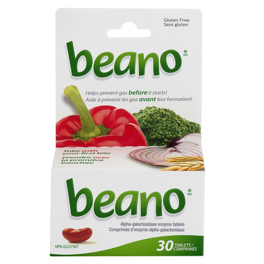 Gluten-free Beano works naturally to help prevent gas before it starts. Beano Alpha-galactosidase enzyme tablets work to help reduce gas production following a meal rich in fermentable carbohydrates (such as vegetables and beans). These tablets contain an enzyme that converts complex carbohydrates so they are more digestible, helping prevent gas, bloating and discomfort caused by many healthful foods including: beans, broccoli, cabbage, cucumber, carrots, leeks, beets, lettuce, peas, corn, onions, peppers, seeds, soy products, whole grains, cereals, and more!