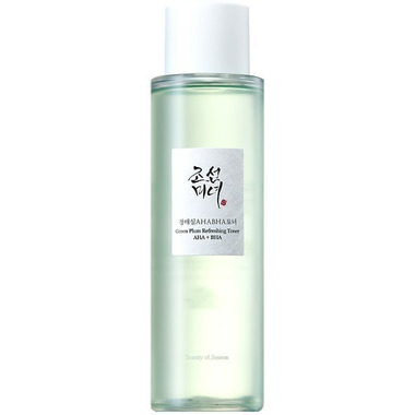 Beauty of Joseon Green Plum Refreshing Toner: AHA + BHA is a lightweight, daily exfoliating toner that smooths skin texture while removing residual impurities. Formulated with plum water, mung bean extract, and gentle exfoliants, it calms and refines the skin without irritation.
