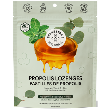 MEDICINAL INGREDIENTS PER LOZENGE: Bee propolis 5:1 extract (Apis mellifera Secretion) (125 mg Dry) ... 25 mg Vitamin D (Cholecalciferol) ... 25 mcg (1000 IU) Zinc (Zinc gluconate) ... 3 mg Eucalyptus essential oil (Eucalyptus globulus Leaf) ... 14 mg