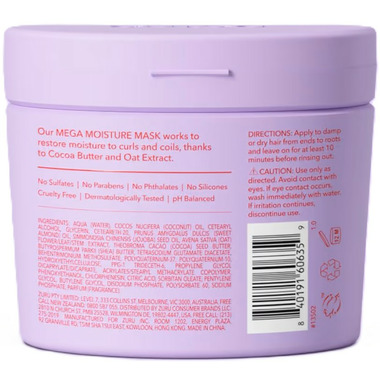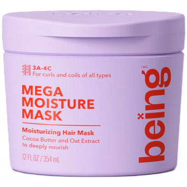 Being MEGA MOISTURE Moisturizing Hair Mask works to restore hydration to type 3A-3C curls and 4A-4C coils, with nourishing natural ingredients. This dermatologically tested, sulfate-free and silicone-free formula is ideal for use as a twice-weekly treatment, or for use in place of a conditioner for hair that is especially dry and/or damaged. Naturally derived Cocoa Butter and Oat Extract help to replenish hairs moisture levels, leaving it feeling hydrated and soft.