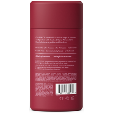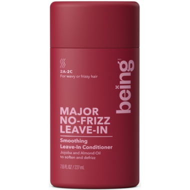 Being MAJOR NO-FRIZZ Smoothing Leave-In Conditioner is perfect for hair in need of additional softnesssuch as type 2A-2C waves and otherwise frizzy or coarse hair. This dermatologically tested, sulfate-free and silicone-free formula is ideal for use after washing, by working into ends to help style naturally, or alternatively for use as a heat protectant. Naturally derived ingredients such as Jojoba Oil and Almond Oil to manage frizz and flyaways, leaving hair soft, manageable and frizz-free.