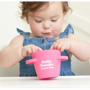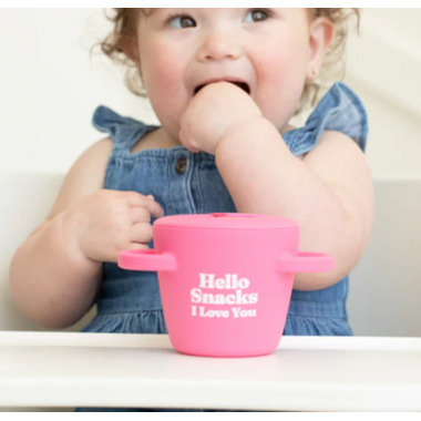 The Happy Snacker is a first-of-its-kind two-piece silicone snack cup with a mess-proof snap-tight lid and soft silicone opening so little hands can easily access food and prevent spills. Designed with easy-grip handles, it fits in car seats and stroller cup holders.