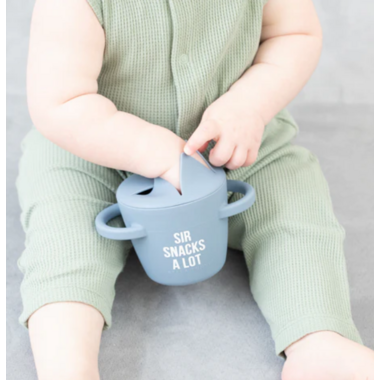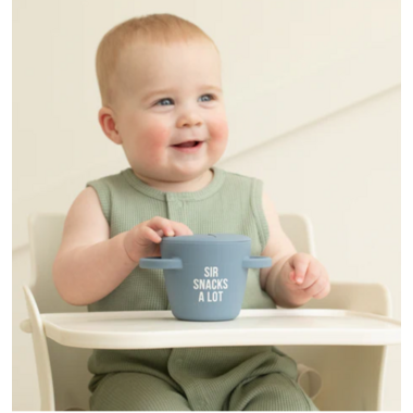 The Happy Snacker is a first-of-its-kind two-piece silicone snack cup with a mess-proof snap-tight lid and soft silicone opening so little hands can easily access food and prevent spills. Designed with easy-grip handles, it fits in car seats and stroller cup holders.
