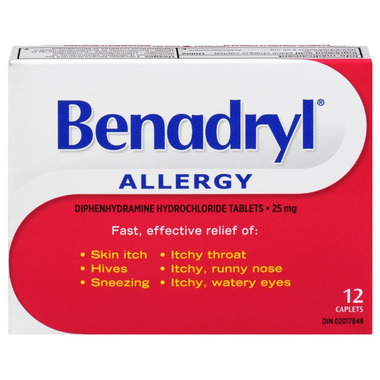 BENADRYL® Caplets provide fast, effective relief from allergies. Each caplet contains 25 milligrams of diphenhydramine hydrochloride, an antihistamine, to treat sneezing, runny nose, itchy and watery eyes, skin itch, and hives.