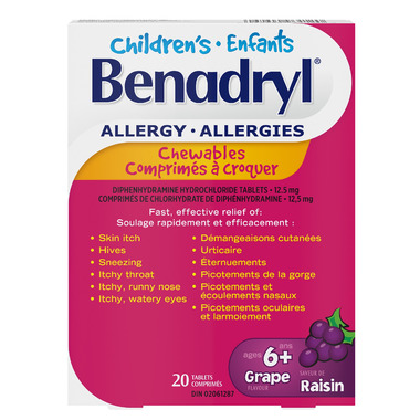 Great tasting grape flavoured Children’s BENADRYL® Chewables are a convenient way to provide fast, effective relief of your child’s allergy symptoms.