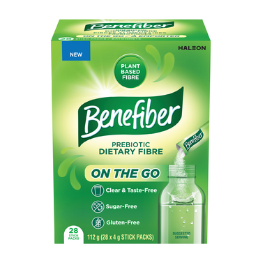 - Enjoy the convenience of Benefiber On the Go Prebiotic Dietary Fibre with 28 (4 g) unflavoured stick packs that dissolve completely in water and non-carbonated beverages.