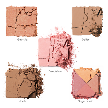 Directions: Sweep Hoola all over face for a matte, natural-looking tan. Swirl Dallas & Georgia on apples of cheeks for a peach-bronze blush, or sweep on Dandelion & Sugarbomb for a pink brightening boost.