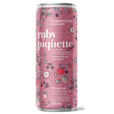 Piquette Zero is a lively and delicious alcohol-free wine-style beverage. Bright ruby color with a magenta hue. The nose offers inviting notes of red and black fruit, lavender and a touch of spice. On the palate, a rich core of fruit, tangy acids and echoing suggestions of blackcurrant. Made in Nova Scotia.