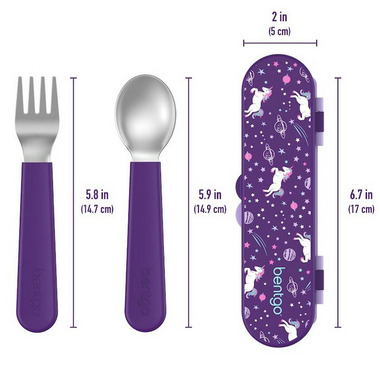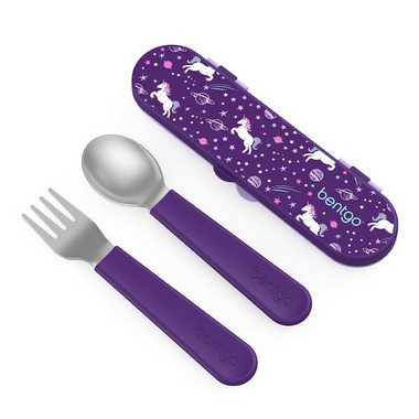 Eating lunch at school or taking food on the go will become much easier for your child with the Bentgo Kids Stainless Steel Utensils. Ergonomically designed for little hands, the durable set comes with a fork, spoon, and a slim storage case, making transporting and storing a breeze. The entire set is made to stand the test of time with high-quality stainless steel and safe, BPA-free materials. The fork and spoon neatly stack inside the carrying case, ensuring your bag or your child's backpack stays clean after use. From playful dinosaur and unicorn prints to bright blues and purple colours, each utensil and carrying case is designed to mix and match with other Bentgo Kids products!