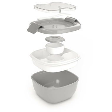 This container is so useful, i like how it all fits together. There is a bottom (bigger unit) that I use for leaves/salad and the top portion where I add cut up cheese, meat, snacks. Kids love it for their school lunch! The only complaint I have is that the dressing container in the middle started leaking within weeks of use. It does not close tight and leaks. It's a mess. I am not looking for a replacement dressing container (something leakproof and easy to open/close). Overall, I'd recommend it but I wish there were no problems with the leaks of the dressing container.
