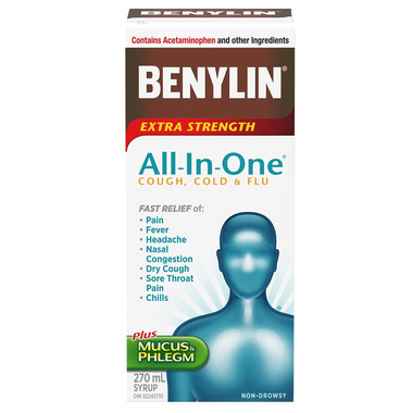 Benylin All-In-One Extra Strength Cough, Cold and Flu Syrup is the most complete formula in the Benylin family of products and helps relieve 8 cold and flu symptoms with 1 simple solution.