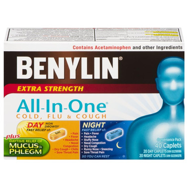 Benylin All-In-One Cold, Flu & Cough Caplets provide both Day and Night relief in one convenient, portable pack. Benylin helps relieve 11 cold and flu symptoms in 1 simple solution.