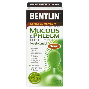 Benylin Extra Strength Mucous & Phlegm Relief Plus Cough Control works in your lungs to break up tough mucous and phlegm, and has an expectorant to clear it from your chest. This extra strength fast-acting offering is specially formulated to loosen and thin out mucous and phlegm so that you can expel it when you cough.