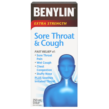 - Benylin Extra Strength Sore Throat & Cough Syrup, 250 mL, is formulated to provide fast relief of your sore throat pain and wet cough