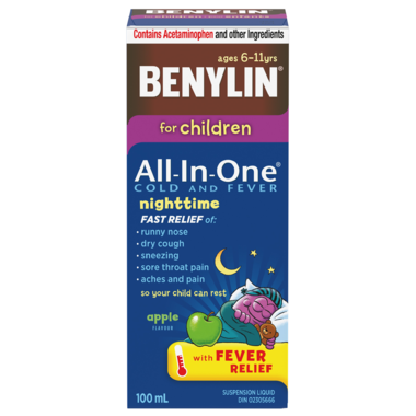 Benylin For Children All In One Cold & Fever Nighttime Syrup is a complete product that combines trusted Benylin ingredients in a great tasting apple flavour. Relieve your kids’ cold & flu symptoms with 1 simple solution to help them get the rest they need.