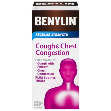 Find relief from cough and congestion using BENYLIN® Regular Strength Cough & Chest Congestion Syrup. This syrup provides fast relief of cough with phlegm, chest congestion, and sore throat pain. Containing cough suppressant and expectorant in each dose, the formula offers a single solution for multiple symptoms. BENYLIN® Regular Strength Cough & Chest Congestion comes in a 100-millilitre or 250-millilitre bottle.