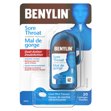 The BENYLIN Sore Throat Lozenge works fast. It has a unique dual-layer formulation that instantly soothe your throat, and provides up to two hours of targeted pain relief. Available in great-tasting cool mint flavour.