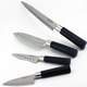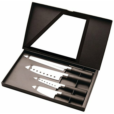 Set includes: 8" carving knife, 7" santoku knife, 5" santoku knife, 4.5" santoku knife packed in a gift box.