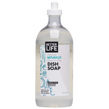 Better Life Dish Soap puts the hurt on grease without sulfates, keeping your hands happy. No need to wear gloves or other accessories – vitamin E and aloe will soothe and moisturize your hands. Discover how pure plant power equals easy rinsing without residue.