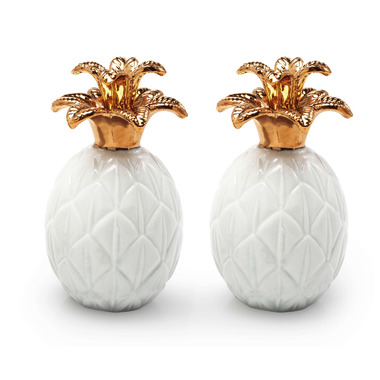 Salt & Pepper Shakers, 3.5" / 9cm H, porcelain. These gorgeous white & gold pineapple shakers will put you right on the tropical home accessory trend. Made from glazed white porcelain and topped with shimmering gold leaves. Hand wash. Giftboxed.