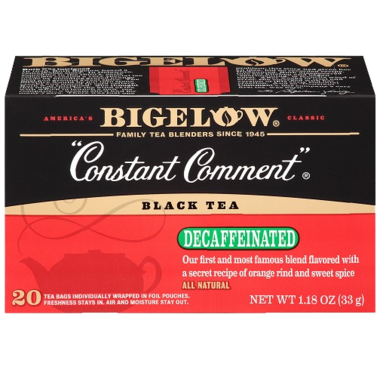 Bigelow Constant Comment Black Tea Decaffeinated is the first and most famous blend flavored with a secret recipe of orange rind and sweet spice.