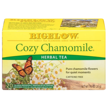 Bigelow Cozy Camomile Herbal Tea. Pure chamomile flowers for quiet moments.