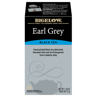 Bigelow Earl Grey Black Tea. Hand-picked black tea delicately blended with real oil of bergamot from Calabria, Italy.