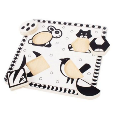 This wooden puzzle has been specifically designed in black and white, due to the fact that black and white are the easiest colours for young children to see and respond to. Each of the four puzzle pieces can be slotted into the animal illustrations and will aid your child's development as they learn to identify and place each one. Each chunky wooden puzzle piece is generously sized to make it easier for little hands to lift, grasp, examine and replace. Helps to develop dexterity, matching skills and concentration. Made from high quality, responsibly sourced materials. 4 puzzle pieces.