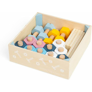 Supplied in a handy eco-friendly wooden crate, this construction toy is ideal for young engineers who are on the move! With a range of different pastel colours, the play possibilities are endless.