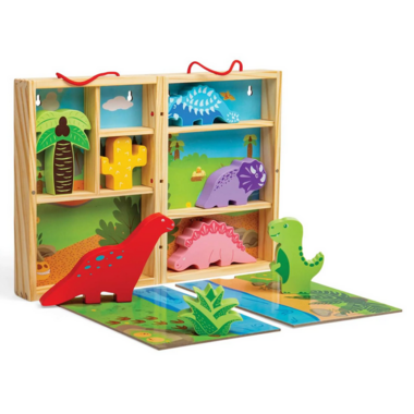Packed with plenty of play value, this Dinosaur Play Box introduces kids to a Jurassic world of friendly dinos. This fun kids activity set features chunky wooden dinosaurs such as a T-Rex, Diplodocus, Stegosaurus, Triceratops and Ankylosaurus as well as exotic play pieces such as a cactus, aloe vera and palm tree.