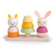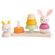 Each of the stacking poles is secured by sturdy elastic string so they can fall down and stand back up again. Stack and assemble the rabbit and fox on the outer poles and build the tree on the middle pole.