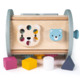 Little fingers can touch, pull, twist, turn, and flip all the different wooden elements on the four sides of the activity roller. This helps them to develop their dexterity and fine motor skills as they explore each side. At the top is a shape sorter where busy hands need to slot the wooden shapes through the correct slot. The activity sorter also opens up for easy access to the wooden shapes, too.