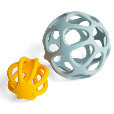 The set comes with a small yellow ball which you can nest inside the larger grey ball. Challenge curious bambinos to see if they can work out how to pull the smaller ball out! A fun game for helping little brains develop.