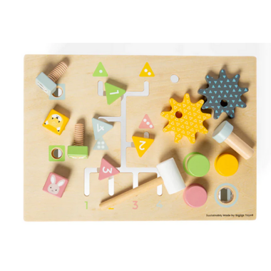 Engage curious youngsters with our FSC Wooden Activity Table Bench. Taking inspiration from nature, not only is our toddler activity table made from sustainably harvested FSC Certified wood, it also features lots of woodland features to keep little hands busy. An activity table packed with plenty of things to do, kids can use the wooden mallet to hammer in the chunky nail pegs, screw in the animal bolt heads, spin the wooden cogs, and slide the four numbered triangles down into the correct slots.