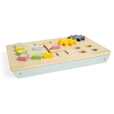 This comprehensive wooden activity table encourages discovery through play, developing tots co-ordination, fine motor skills and dexterity. Four sturdy table legs ensure it can withstand many enthusiastic play sessions. Suitable for 18+ months.