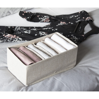 The ultimate drawer organizer, Bigso's 6 slot small drawer organizer is sized for most drawers and is useful to organize socks, ties, and various lingerie. Ships and folds flat when not in use, zipper together to assemble. Made in heavy duty polyester.