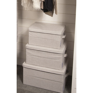 Bigso Box of Sweden's Soft Storage Boxes with lid offers a wide variety of storage possibilities - from office to living room to closet. Sold as a set of three, one of each available size. Featuring strong and durable construction made from polyester and paperboard, this handy rectangular lidded box also features handles for easy carrying from room to room. It's ideal for storing toys, throws, extra pillows, and more. Each size ships flat, and can be quickly folded flat for storage when not in use. It's ingenious collapsible design allows for quick and simple assembly without tools.